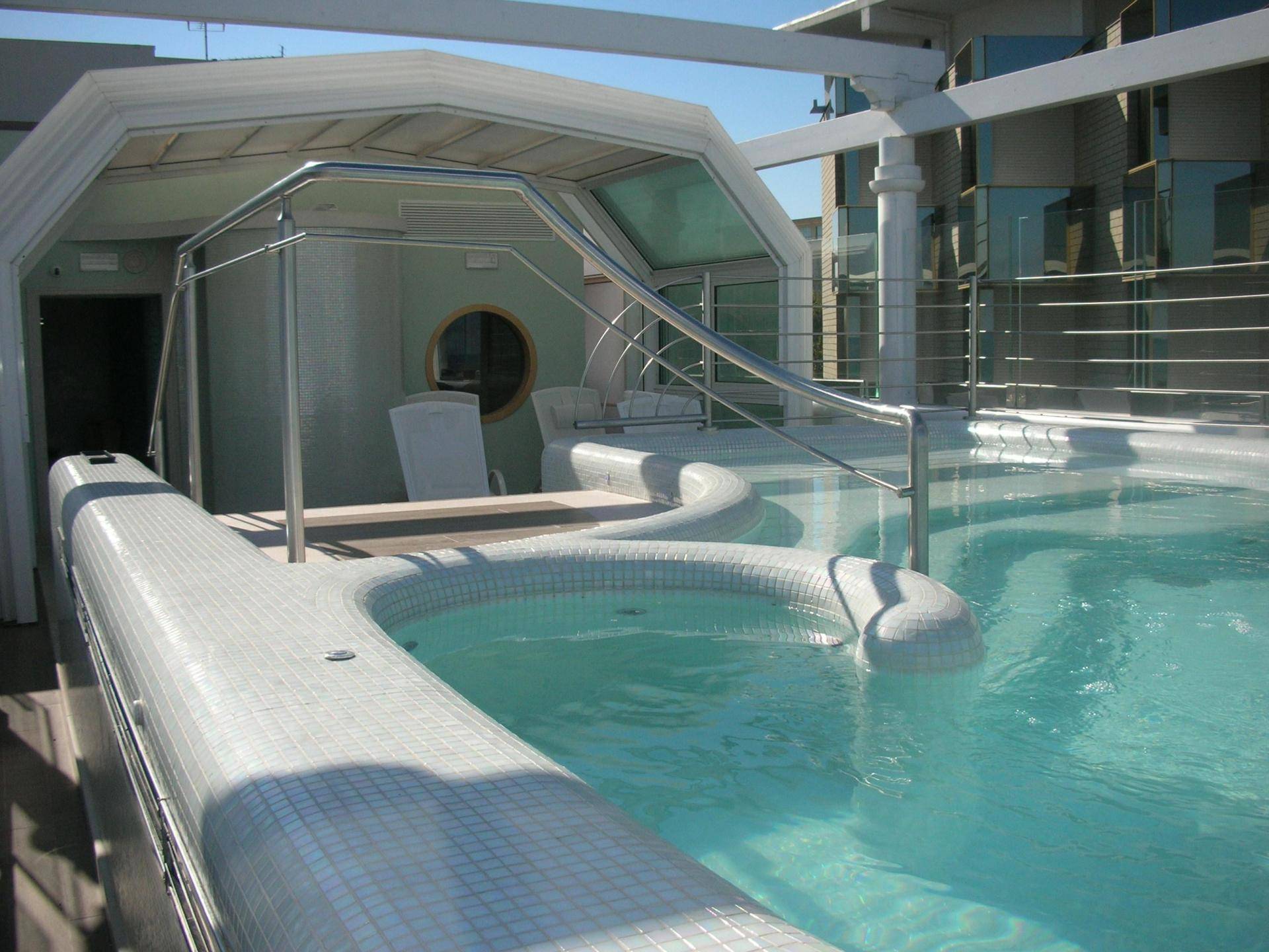 The hot tub at Hotel de Londres, built in 2010 on the hotel’s terrace overlooking the Rimini seafront, represents a unique solution in a central urban context. The rectangular EPS structure with a steel core incorporates an air heating system for winter use and a telescopic cover that allows year-round enjoyment. The variable depth with a shallow wading area, dedicated hydro-massage stations, and cervical jets provide a complete relaxation experience, while the perimeter air blade prevents the glass cover from fogging. Finished with glass mosaic inside and natural stone outside, the pool combines functionality, comfort, and design, overcoming space limitations and creating a distinctive feature for the hotel.