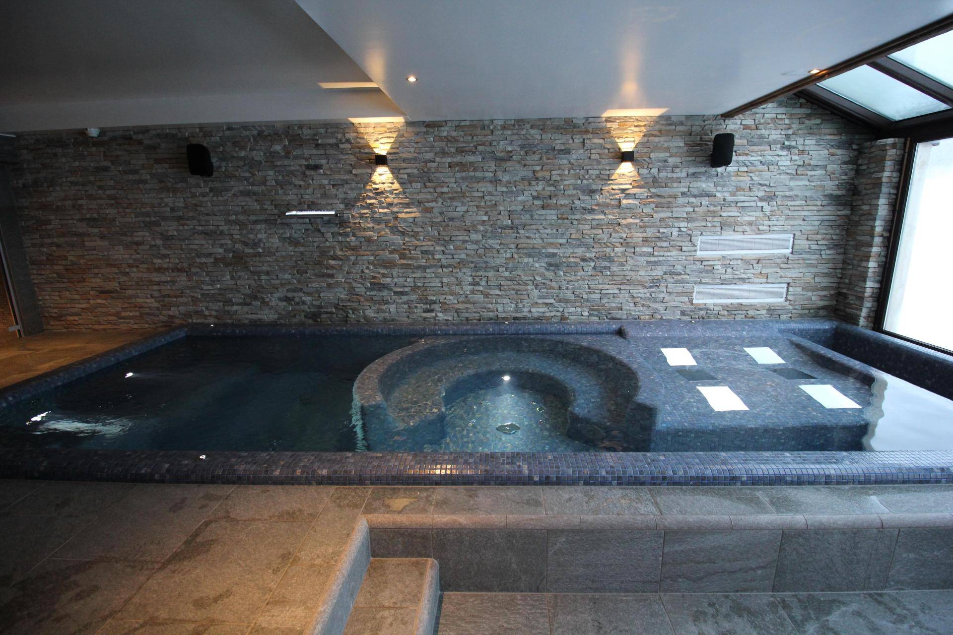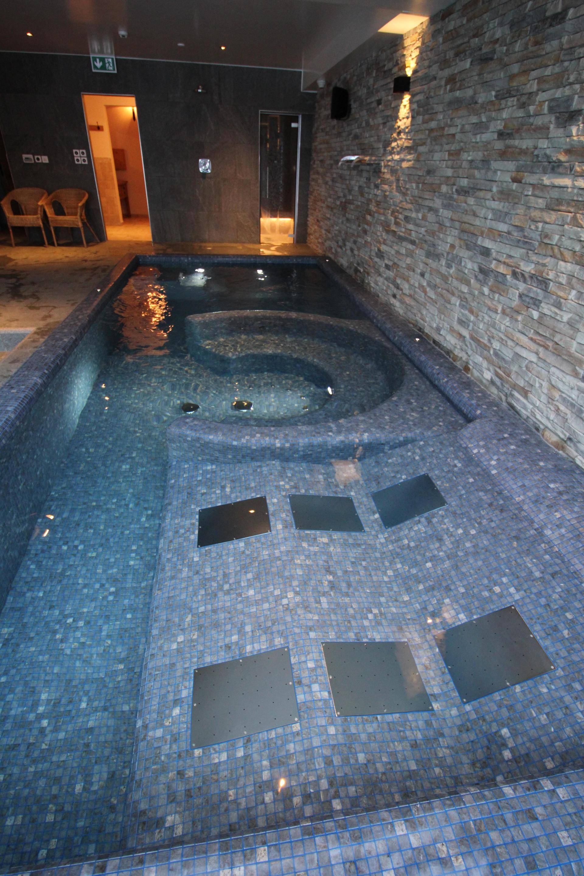 The tub, finished in elegant mosaic, features loungers, a circular hydro-massage bench, and a counter-current swim, providing a complete relaxation experience.
