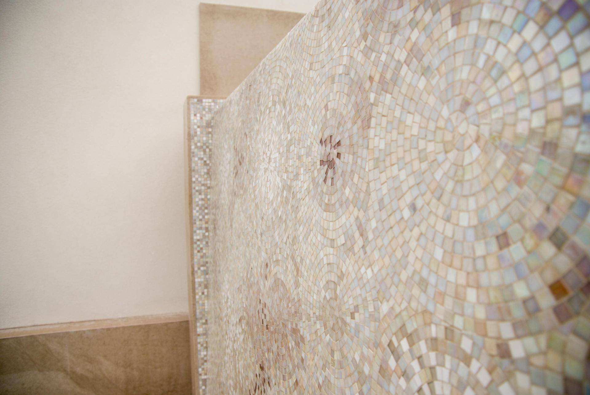The project consists of a medium-sized hot tub located on the terrace level, a two-level platform surrounding it, and a generously sized Superior Pool installed directly on the roof of the house. Stepping out onto the balcony, you are greeted by a small flight of steps inviting you to enter the first tub. It features a unique fluid shape that encloses three comfortable hydro stations in its recesses. The overflow, hidden under the edge, is elegant and creates a continuum with the platform that surrounds the pool. Ideal for a moment of relaxation and an aperitif with friends, once inside, you can admire the roofs of historic Milan on the open side and, on the opposite side, the magnificent pearl-coloured cladding laid with extreme skill by master mosaicists and characterised by sophisticated spiral geometries. It is on this waterfall wall that the Superior pool skims the water, creating an evocative atmosphere for guests in the pool on the lower level. A second flight of stairs leads to a large terrace on the roof of the flat. Here, the client requested the installation of a second pool called ‘Superior’ due to its location and generous size of approximately 30 square metres with a maximum depth of 150 cm. The pool is equipped with numerous accessories such as an entrance staircase, hydromassage stations, counter-current swimming and alarms for accidental falls into the water. This series of optional extras makes the pool safe and ideal even for the most athletic people looking for a moment of escape from the daily routine of the city.