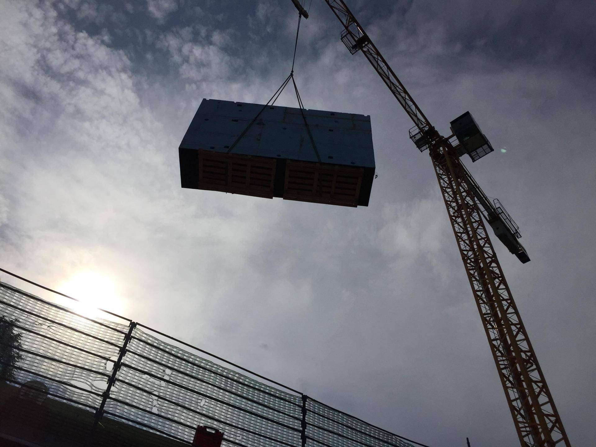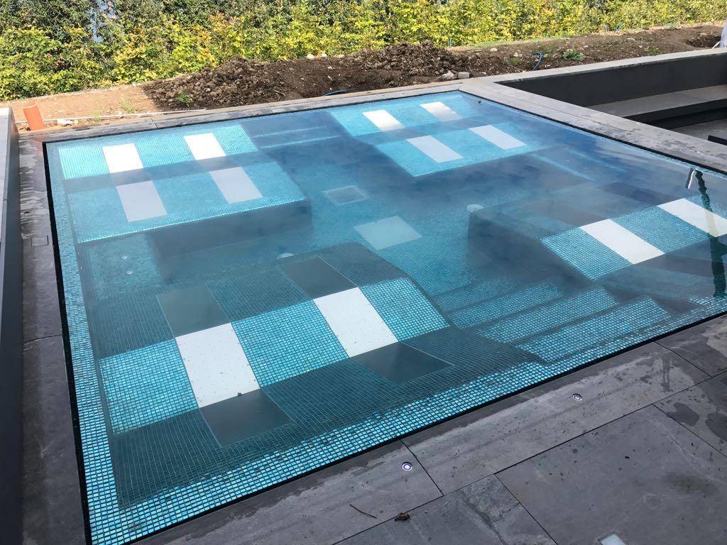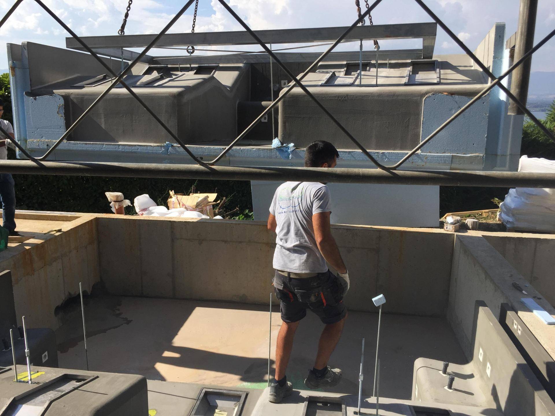 Construction of a large overflow whirlpool with mosaic finish, delivered in two sections and moved using a crane.