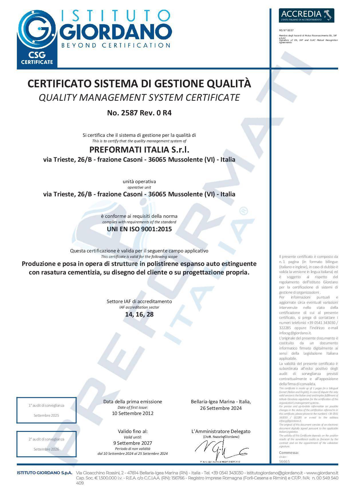 L'Attestazione SOA ottenuta da Preformati Italia è un attestato obbligatorio (rilasciato da organismi autorizzati) che comprova la capacità economica e tecnica di un'impresa di qualificarsi per l'esecuzione di appalti pubblici di lavori di importo maggiore a €150.000,00 e conferma inoltre che il soggetto certificato sia in possesso di tutti i requisiti necessari alla contrattazione pubblica. Preformati Italia ha ottenuto una attestazione SOA di terzo grado per partecipare ad appalti di importo fino a € 1.033.000.