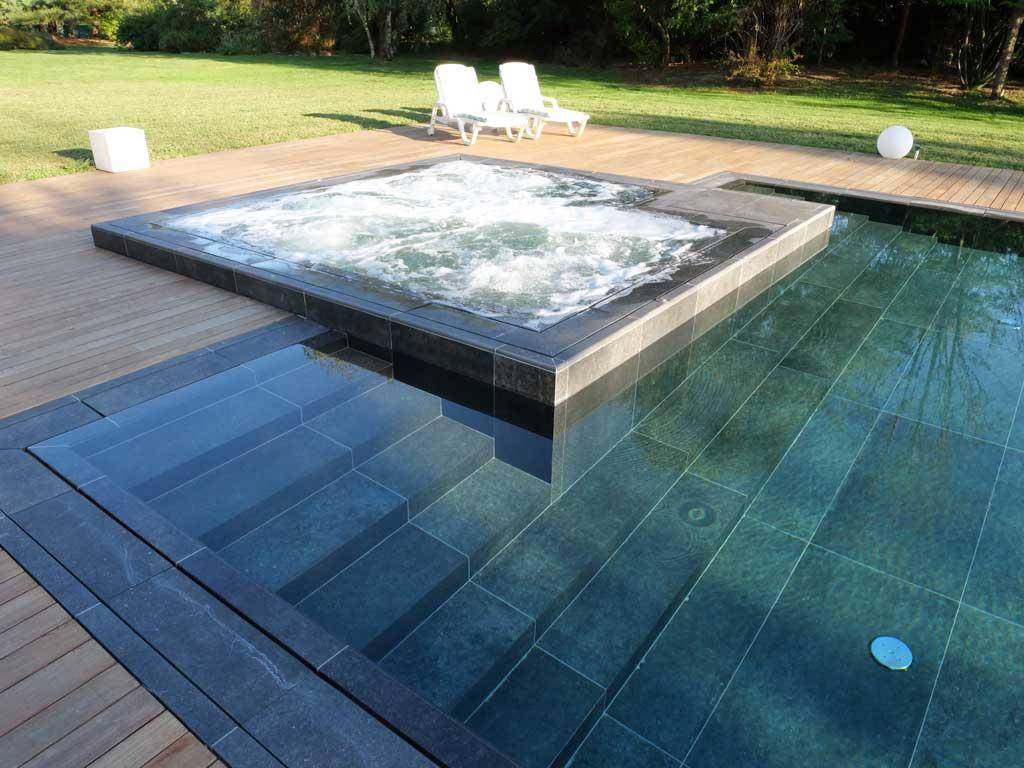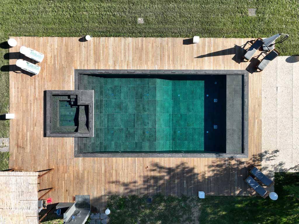 La piscina, di forma rettangolare, è corredata da una zona idromassaggio innestata in uno dei lati minori e presenta due aree di profondità differenti per consentire di vivere l'acqua al pieno delle sue potenzialità.