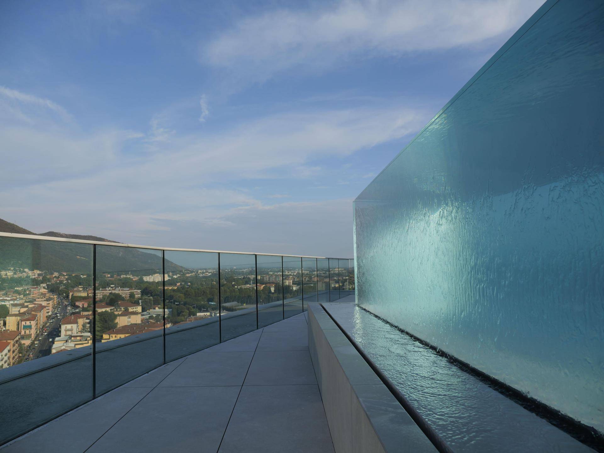 Di grande bellezza è la parete in acrilico trasparente spessa 70 millimetri, dalla quale l’acqua sfiora elegantemente riversandosi nella canaletta di raccolta sottostante dopo uno sbalzo di un metro, che dona movimento e dinamismo. Il rivestimento in gres interno ed esterno è stato scelto di colore chiaro per conferire un senso di continuità tra gli spazi, amplificandoli, oltre a una tonalità limpida e cristallina all’acqua stessa.