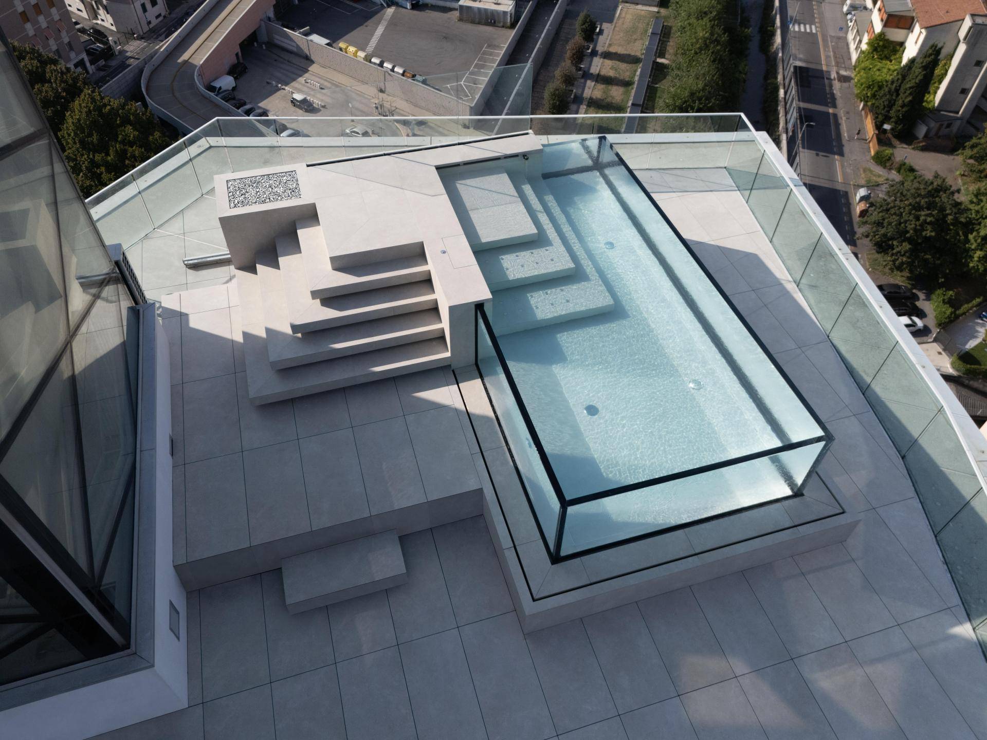 Una piscina trasparente con bordo a sfioro posta al quindicesimo piano di uno dei complessi più prestigiosi della Leonessa d’Italia, palazzo Fuksas, in cui vivere momenti di relax con una vista davvero mozzafiato, da un lato la cupola del Duomo Nuovo e del Castello arroccato sul colle Cidneo, dall’altra i boschi del monte Maddalena. Un osservatorio privilegiato sospeso tra città e natura, voluto dalla committenza per ritagliarsi il proprio Eden in totale privacy.