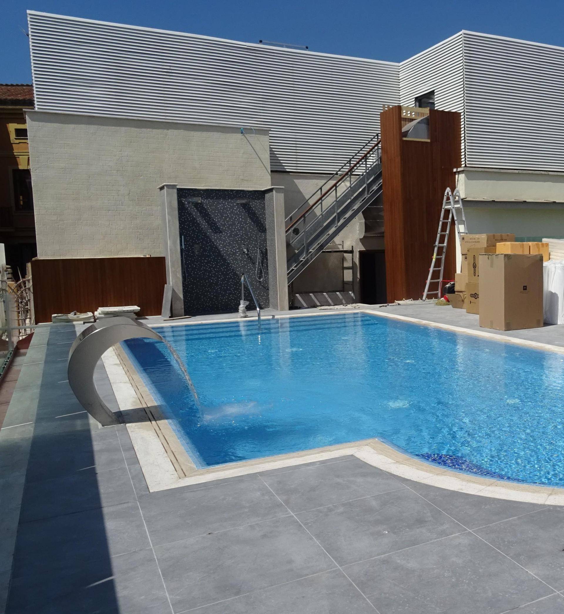 Realizzazione di una piscina su terrazzo con finiture in mosaico e travertino, in collaborazione con Idroedil Piscine.