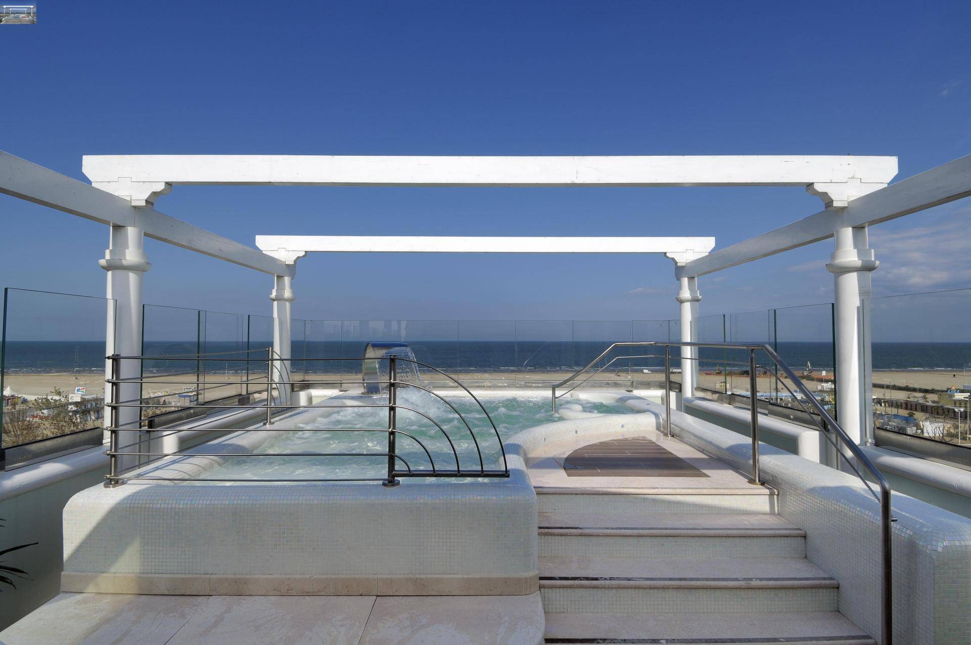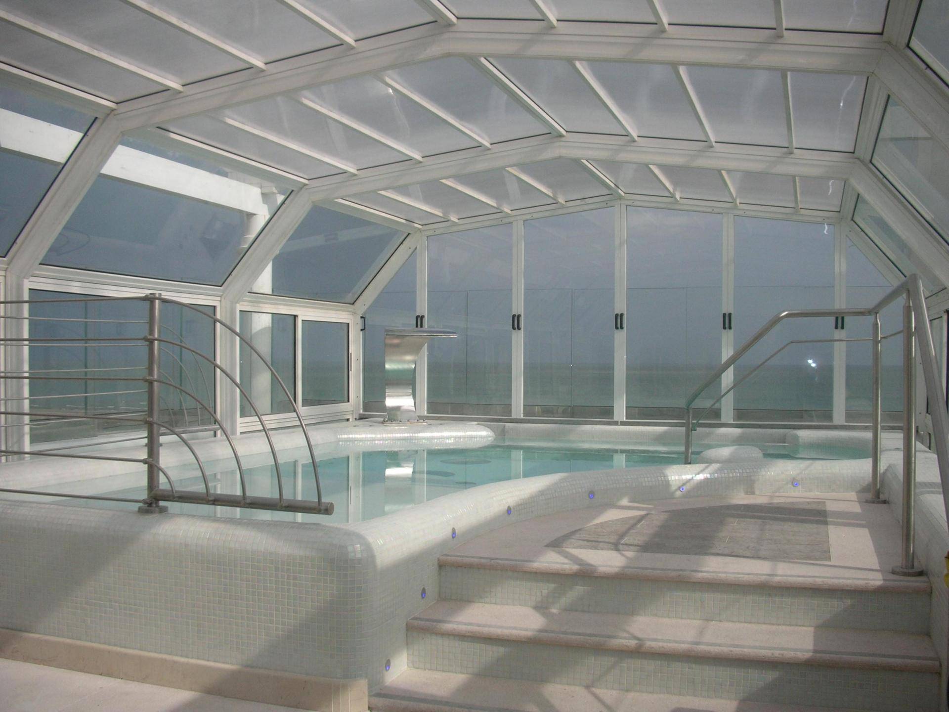 La vasca idromassaggio dell’Hotel de Londres, realizzata nel 2010 sulla terrazza dell’hotel con vista sul Lungomare di Rimini, rappresenta una soluzione unica nel contesto urbano centrale. La struttura quadrangolare in EPS con anima in acciaio integra un impianto ad aria per il riscaldamento invernale e una chiusura telescopica che permette l’utilizzo tutto l’anno. La profondità variabile con effetto bagnasciuga, le postazioni idromassaggio e il getto cervicale offrono un’esperienza di relax completa, mentre la lama d’aria perimetrale evita l’appannamento della copertura vetrata. Realizzata con mosaico vetroso all’interno e pietra naturale all’esterno, la vasca unisce funzionalità, comfort e design, superando le limitazioni dello spazio disponibile e creando un elemento distintivo per l’albergo.