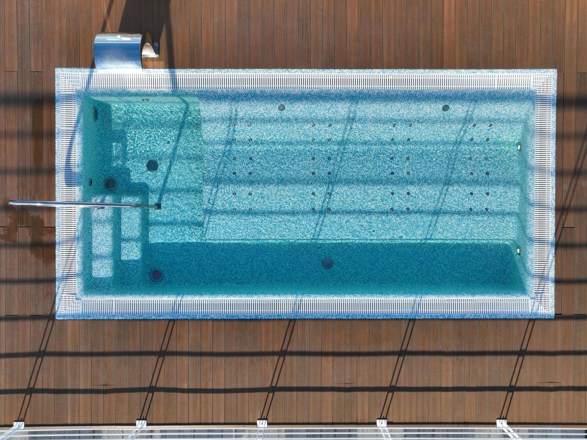realizzare una vasca monoblocco è stata proposta da Preformati Italia alla committenza per evitare la sovrapposizione dei lavori in corso d'opera delle imprese coinvolte nel progetto rispettando, di conseguenza, i tempi previsti di esecuzione. La piscina KLIMAPOOL è stata realizzata completamente in sede produttiva per poi essere trasportata e collocata sul terrazzo azzerando i tempi di montaggio in loco.