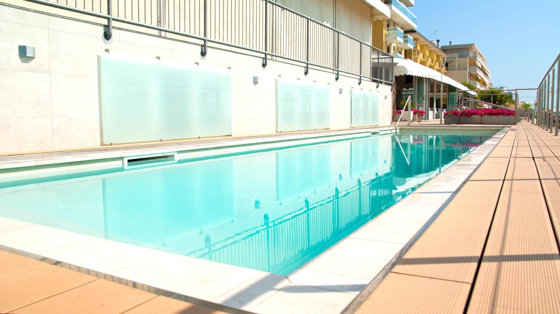 Piscina fuoriterra installata nell’area esterna dell’Hotel Vidi e Delfino di Jesolo, realizzata con struttura autoportante tramite il sistema Klimapool Erectus brevettato da Preformati Italia. Il sistema costruttivo, con pilastrini e cordolo in calcestruzzo armato integrati, assicura stabilità e rapidità di posa.